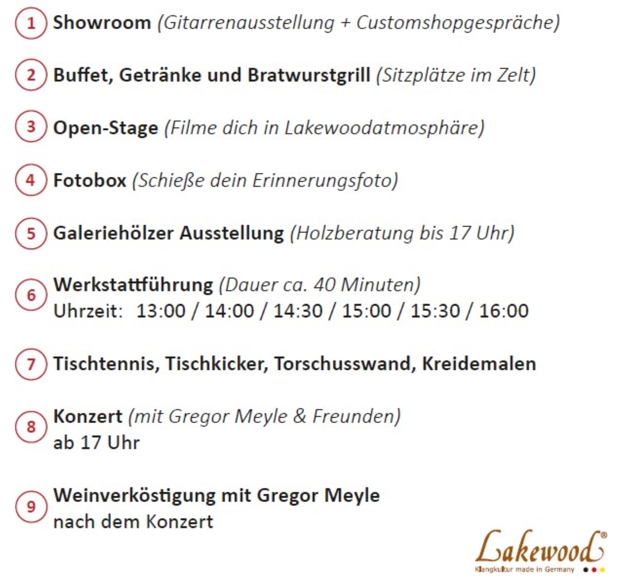 Der Katalog behält auch im Jahr 2025 seine Gültigkeit. Er beinhaltet unsere gesamte Modellpalette und eine Zusammenfassung des Lakewood Customshop. Am wichtigsten zu erwähnen sind natürlich unsere Neuheiten - eine neue European Wood Serie, eine erweiterte Premium Serie und viele überarbeitete Modelle in der Natural und Deluxe Serie. Und es haben sich sogar noch einige ganz neue Modelle unter diese Serien gemischt! Die wichtigsten technischen Spezifikationen aller Modelle sind zwar in der Broschüre enthalten, auf unserer Webseite sind sie jedoch noch ausführlicher und übersichtlicher zu erfassen und können miteinander verglichen werden. Auf Wunsch schicken wir Dir den Katalog 2024 auch gern nach Hause. Schick uns dazu bitte eine Email mit Deiner postalischen Anschrift an info@lakewood.de.
